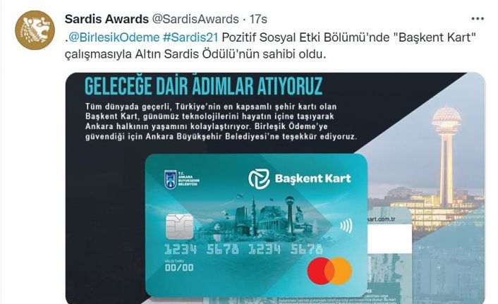 Ortak akla değer vererek sosyal sorumluluk projeleri başta olmak üzere vatandaşların hayatını kolaylaştıran birçok yeni uygulamayı hayata geçirmeye devam eden Ankara Büyükşehir Belediye Başkanı Mansur Yavaş’ın yönetim anlayışı, ulusal ve uluslararası birçok kuruluş tarafından ödüle layık görülüyor. Başkent’te ‘bir elin verdiğini diğeri görmeyecek’ diyerek sosyal yardım anlayışını kökten değiştiren Yavaş’ın başlattığı “Başkent Kart” uygulaması ‘Sardis Ödülleri’ kapsamında 3 altın ödüle layık görüldü. Finans dünyasının tüm bileşenlerinin buluştuğu, yenilikçi projelerin ve pazarlama başarılarının ödüllendirildiği ve bu yıl üçüncüsü gerçekleşen Sardis Ödülleri 30 Eylül’de düzenlenen törenle açıklandı. Sunuculuğunu Simge Fıstıkoğlu’nun üstlendiği Sardis Ödülleri töreninde yapılan 225 başvuru sonucunda ödüller; İnovasyon, Finans ve Finans Teknolojilerinin Yenilikçi Kullanımı, Pozitif Sosyal Etki olmak üzere 4 bölüm altında 65 kategoride dağıtıldı. Birçok önemli kuruluşun ödül aldığı Sardis Ödülleri’nde Başkent Kart uygulamasını hazırlayan Birleşik Ödeme Hizmetleri ve Elektronik Para Anonim Şirketi, “Pozitif Sosyal Etki bölümünde”; Toplumsal Sosyal Sorumluluk Altın Ödülü, Ekonomik Sorumluluk Altın Ödülü, Sosyal İnovasyon Altın Ödülün alarak 3 altın ödülün sahibi oldu.
