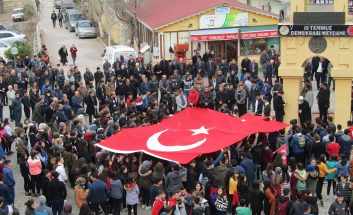 Saygı duruşu ve istiklal marşının okunmasının ardından Anadolu İmam Hatip Lisesi Müdürü Recep Akbaşlı tarafından Kur’an-ı Kerim okunarak dualar edildi. Dualar sonrasında konuşan Türk Eğitim-Sen ilçe Temsilcisi Mahmut Yetişgen, "Sözün bittiği yerdeyiz. İdlib’de Mehmetçiğimize yönelik hain saldırı hepimizi derinden üzmüştür. Ülkemize yönelik hain planları bertaraf etmek için verdiğimiz mücadele birilerini rahatsız etmiş ki hainler bizi can evimizden vurmaya kalkmışlardır. Kahraman şehitlerimize Allah’tan rahmet ailelerine sabırlar diliyorum. Türk milletinin düşmanlarına bu meydandan haykırıyoruz bu cennet vatan bize mezar olmadan size Gülizar olmaz’ diye konuştu.