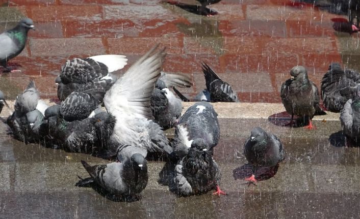 Bahar mevsimiyle birlikte hava sıcaklığı 24 dereceyi buldu, Şehreküstü meydanında bulunan binlerce güvercini serinletmek ise temizlik görevlisine düştü. Meydanın simgesi güvercinler sıcak havalarda serinlemek için temizlik görevlisi Ramazan Yıldırım’ın hortumla tuttuğu suyun altına kendini atıyor.