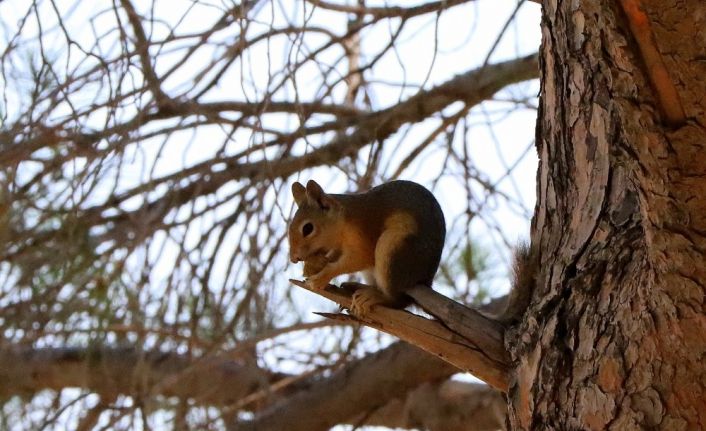 Manisa’nın Saruhanlı ilçesinde bir sincabın, çam ağacının dalında yemek yediği anlar objektiflere takıldı.