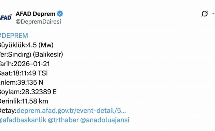 AFAD’dan alınan bilgilere göre, saat 18.11’merkez üssü Balıkesir’in Sındırgı ilçesi olan 4.5 büyüklüğünde deprem meydana geldi. Yerin yaklaşık 11.58 kilometre derinliğinde gerçekleşen sarsıntı, çevre ilçelerin yanı sıra Bursa başta olmak üzere Marmara Bölgesi’ndeki birçok ilde hissedildi. Kısa süreli paniğe yol açan deprem sonrası ilk belirlemelere göre olumsuz bir durum bildirilmedi.