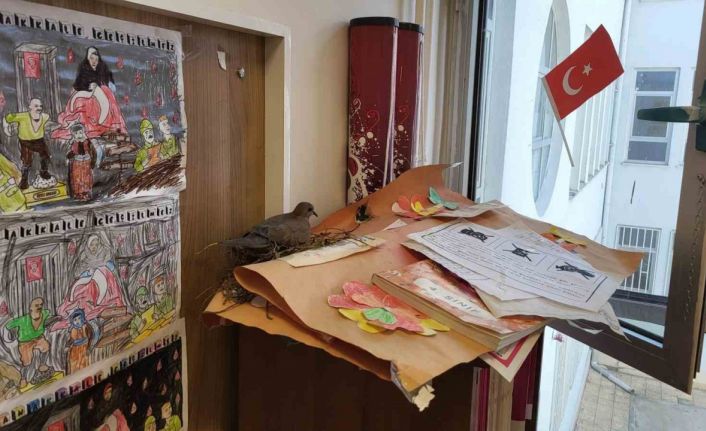 Adıyaman’da sınıfa yuva yaparak 2 yumurta bırakan yusufçuk kuşu, ders sırasında da sınıftaki yuvasında bekliyor.
