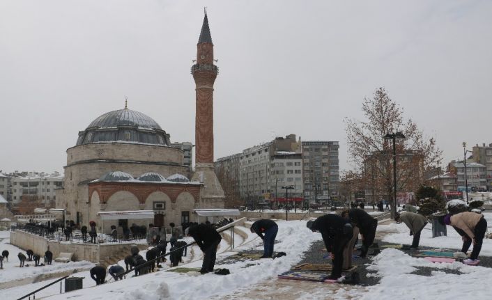 Sivas’ta vatandaşlar, cuma namazını karla kaplı açık alanda eksi 9 dereceyi bulan soğukta ve kar yağışı altında kıldılar.