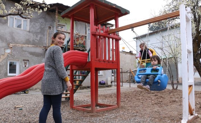 Sivas’ta korona virüs (Covid-19) nedeniyle evden çıkamayan çocuklar, babalarının evin bahçesine kurduğu oyun parkında zaman geçiriyor.