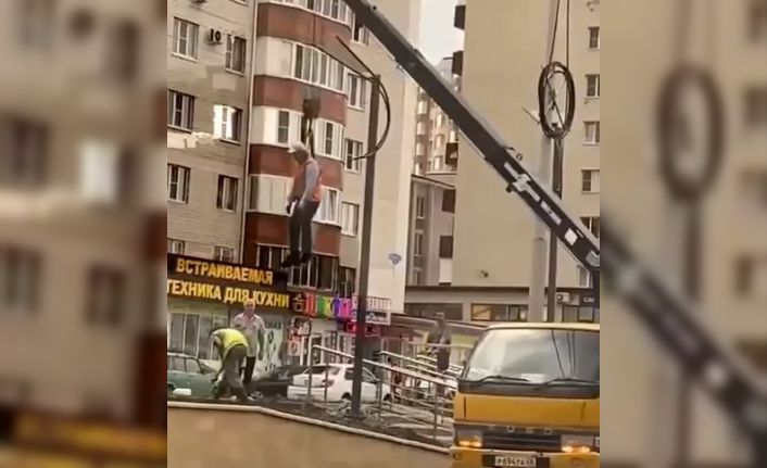 Rusya’da bir işçi sokak lambasını halatla vince bağlanarak tamir etti.