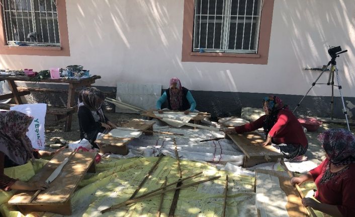 Adana’da kadınlar sosyal mesafeye uyarak imece usulü yufka ekmek yapıyor. Kadınların ekmek mesaisine erkekler de odun ateşini yakarak destek verdi.
