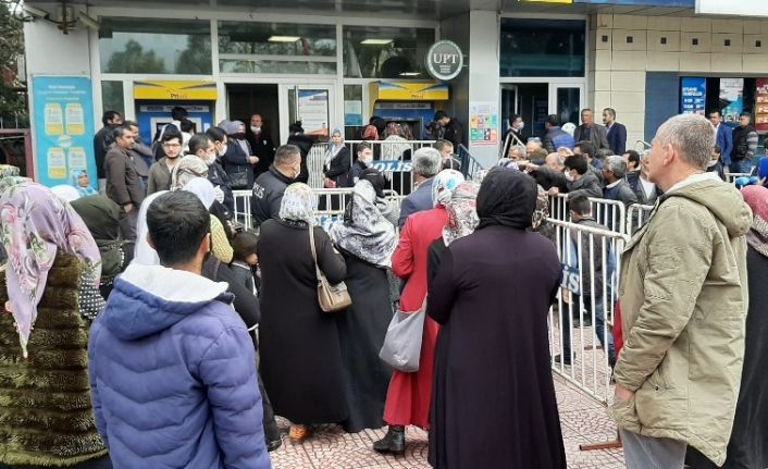 Adıyaman’da sosyal yardım parasının dağıtıldığını duyan vatandaş PTT Şubelerine akın etti. Polis, kalabalığı sosyal mesafe seviyesine getirebilmek için uzun uğraşlar verdi.