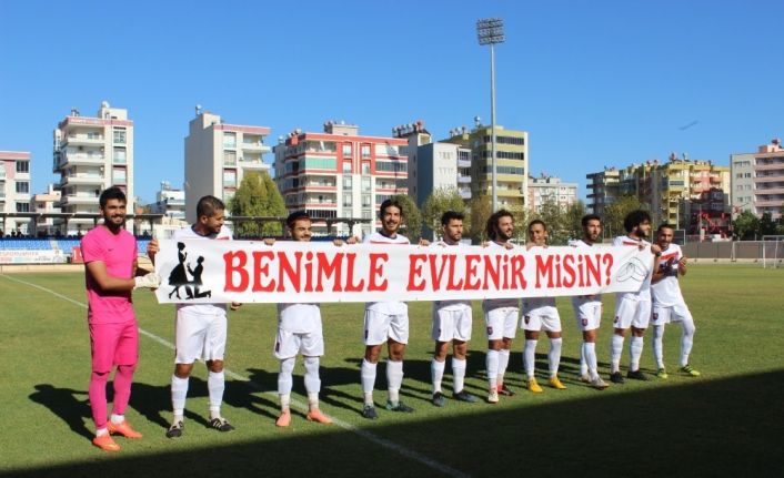 Mersin Süper Amatör Lig’de mücadele eden Silifke Belediyespor’da top koşturan Özcan Özdemir (24), tribünde kendisini izleyen kız arkadaşı Eda Naz Gökçetin’e (26) maçı izlemeye gelen 2 bin kişinin önünde sürpriz evlilik teklifi yaptı.