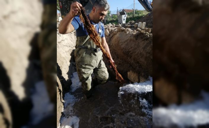 MASKİ Genel Müdürlüğü ekipleri tarafından, Saruhanlı ilçesine bağlı Halitpaşa Mahallesinin içme suyu hattında yapılan bakım çalışması sırasında 5 metrelik ’kunduz’ adı verilen ağaç kökü çıkarıldı.