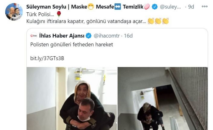 İçişleri Bakanı Süleyman Soylu, Twitter hesabından Çorum’da yaşlı kadını 5’inci kata taşıyan polisin fotoğrafını paylaşarak "Türk Polisi. Kulağını iftiralara kapatır, gönlünü vatandaşa açar" notunu düştü.