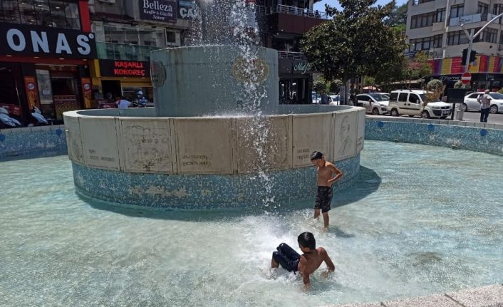 Manisa’nın Şehzadeler ilçesinde sıcaktan bunalan çocuklar, yasak ve tehlikeli olmasına rağmen süs havuzlarında serinlemeye çalışıyor.