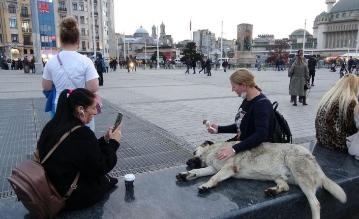 Taksim Meydanı gezmeye gelen Bosna-Hersekli turistler burada bulunan sevimli köpeğe yoğun ilgi gösterdi. Bir turist yediği dondurmadan köpeğe de ikram etti.
