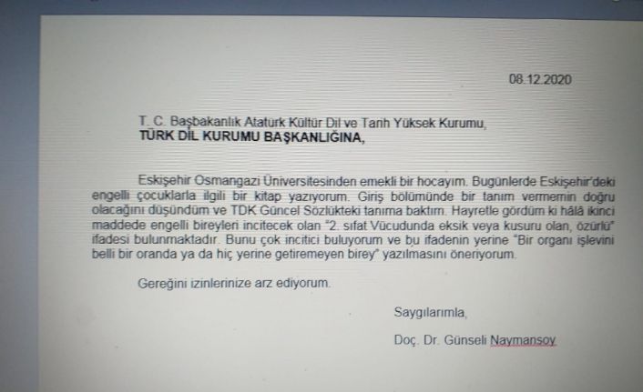 Eskişehir Osmangazi Üniversitesi’nden emekli olan araştırmacı yazar Doç. Dr. Günseli Naymansoy, engelli çocuklar hakkında yazdığı kitabın giriş bölümünde “engelli” kelimesinin tanımını vermek isterken karşılaştığı ifadenin değiştirilmesi için Türk Dil Kurumu’na (TDK) bir dilekçe yazdı.