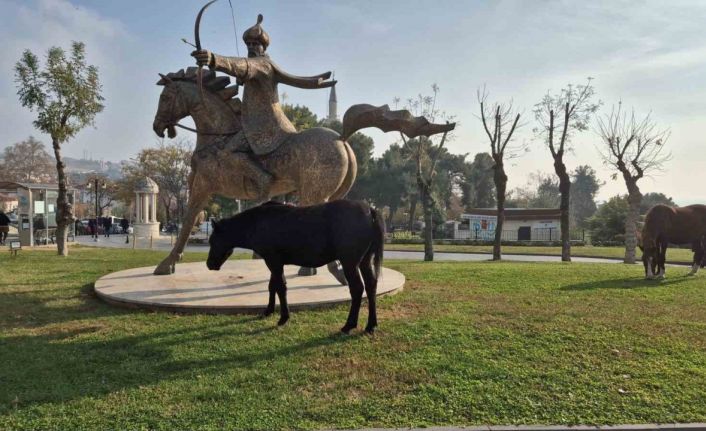 İlçede 1 aydır her hafta farklı bir mahallede görülen başıboş atlar, bu kez de atlı heykelin gölgesinde mola verdi. Heykelin çevresinde ot yiyerek karınlarını doyuran atlar, çevredeki vatandaşların ilgi odağı oldu. Atları görüntüleyen vatandaşlar, eğlenceli fotoğraf kareleri yakaladı.