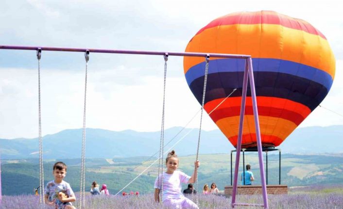 Mahallesi’ndeki yaklaşık 7 dönümlük alanda ekili lavanta tarlası, ziyaretçilerini ‘Dışarıdan stres getirmek yasaktır’ tabelası ile karşılıyor. Buraya gelen vatandaşların ilk ilgi odağı mor tarlaya konulan uçan balon oluyor. Vatandaşlar, mor tarlaya görsel amacıyla konulan uçan balon, salıncak, kapı, pencere, bisiklet gibi dekorlarla bol bol fotoğraf çekilmenin keyfini yaşadı. Mora bürünen tarla, dron ile havadan da görüntülendi.
