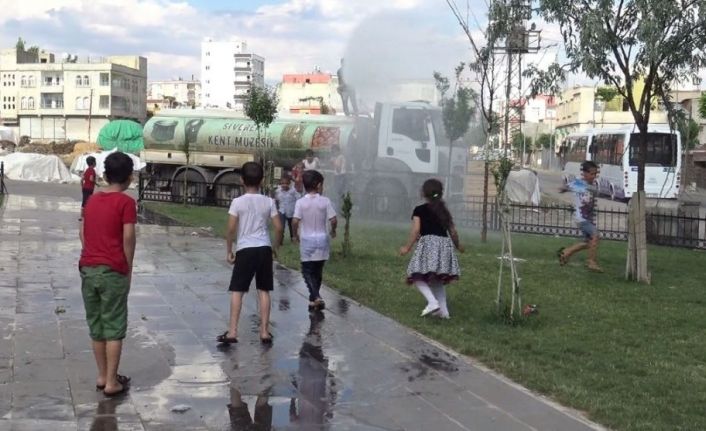 İlçenin Dicle Mahallesi’nde sıcaktan bunalan çocuklar, parkları sulamak amacıyla belediyeye ait arazözden sıkılan suyun altına girerek serinlemeye çalıştı. Çocuklar bu sayede hem serinlenirken, hem de eğlenceli zaman geçirdi.