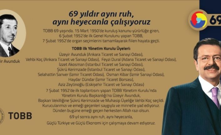 Başkanı olduğu Türkiye Odalar ve Borsalar Birliğinin 69. yılını kutlayan Rifat Hisarcıklıoğlu, ”69 yıl sonra aynı ruh, aynı heyecanla, güçlü Türkiye ve güçlü ekonomi için çalışmaya devam ediyoruz” dedi.