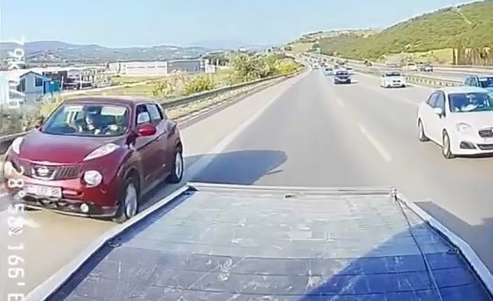 İzmir-İstanbul otobanında ilerleyen sürücüler, bazı bölgelerde yoğun bir trafikle karşılaştı. Bu yoğunluktan sıkılan sürücülerden biri, hızla akan trafiği tehlikeye düşürerek en soldan en sağ şeride zikzak çizerek geçti. Daha sonra emniyet şeridini de ihlal eden sürücü, önündeki çekici kamyonu da sağladı.