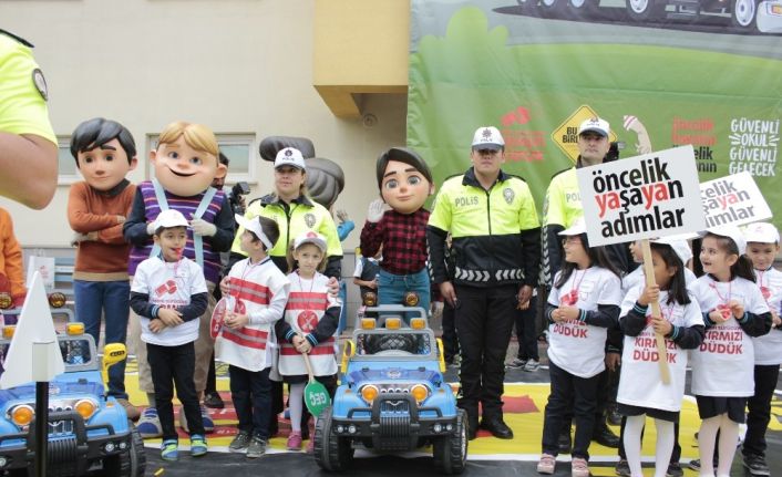 Programda ellerinde Türk bayrakları bulunan çocuklar şarkılara eşlik etti. Heyecanları yüzlerinden okunan çocuklar, Mobil Trafik Eğitim Tırı’na binerek kurallar hakkında bilgiler aldı, trafik eğitim alanında da akülü araçlara binerek trafik kurallarını uyguladı. Çocukların sarhoş gözlüğü ile mini kaleye gol atmaya çalışması ise izleyenleri güldürdü.