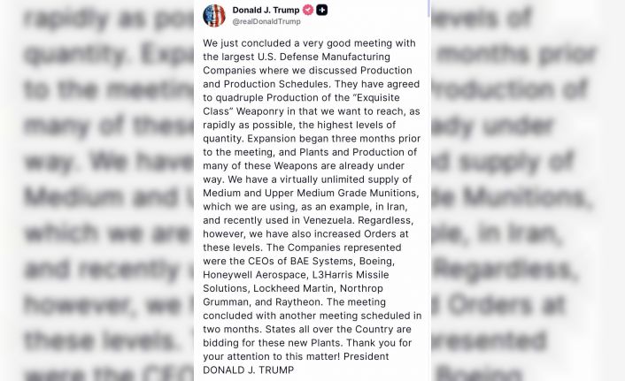 ABD Başkanı Donald Trump, silah üreticisi şirketlerin yöneticileri ile bir toplantı gerçekleştirdi. Truth sosyal medya platformundan yaptığı açıklamada toplantının çok iyi geçtiğini söyleyen Trump, üretim ve üretim takvimi konularını ele aldıklarını ifade etti. Görüştüğü şirketlerin yöneticilerinin üretimi artıracağını vurgulayan Trump, "Şirketler, mümkün olan en kısa sürede en yüksek üretim miktarına ulaşmak istediğimiz ’gelişmiş silahların’ üretimini dört katına çıkarmayı kabul ettiler" ifadelerini kullandı.