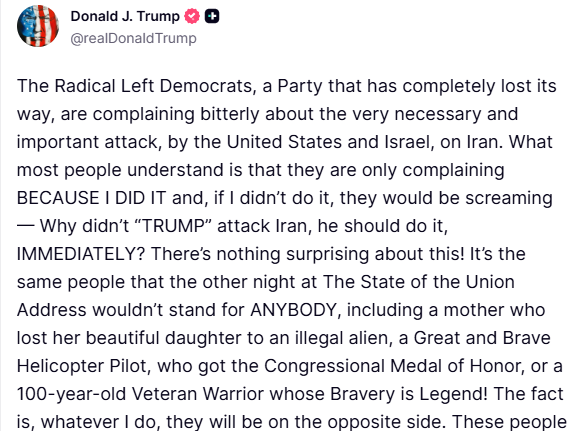 ABD Başkanı Donald Trump, Demokratların ABD ve İsrail’in İran’a yönelik saldırılarını sadece kendisinin döneminde yapıldığı için eleştirdiğini savunarak, "Gerçek şu ki, ne yaparsam yapayım karşısında olacaklar. Bu insanlar hasta, çılgın ve kaçık" açıklamasında bulundu.