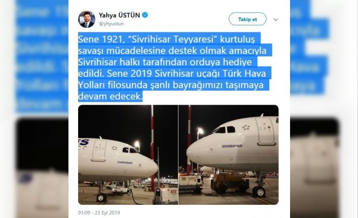 Türk Hava Yollarının yeni teslim aldığı Airbus A321 NEO tipi uçağın adının “Sivrihisar ” olduğunu Türk Hava Yolları Basın Müşaviri Yahya Üstün sosyal medya hesabından duyurdu. Üstün sosyal medya hesabından “Sene 1921, “Sivrihisar Teyyaresi” Kurtuluş Savaşı mücadelesine destek olmak amacıyla Sivrihisar halkı tarafından orduya hediye edildi. Sene 2019 Sivrihisar uçağı Türk Hava Yolları filosunda şanlı bayrağımızı taşımaya devam edecek” paylaşımını yaptı.