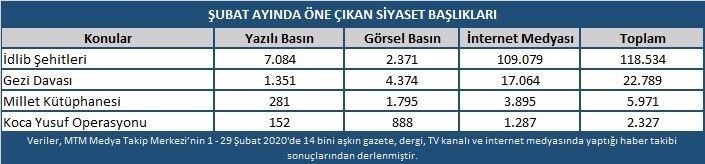 Medya Takip Merkezi’nin (MTM) yaptığı araştırmaya göre Şubat ayında yaşanan olaylar arasında Türkiye, en çok İdlib’de şehit verdiği askerlerini konuştu. Gezi Parkı davasında 9 sanığın beraat etmesi, Şubat ayının gündeminde yer alan gelişmelerden biriydi. Başarıyla gerçekleştirilen Koca Yusuf Operasyonu da diğer bir gündem başlığıydı.
