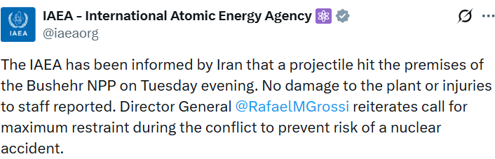 Uluslararası Atom Enerjisi Ajansı, İran yönetiminin Buşehr Nükleer Santrali yerleşkesine salı akşamı füze isabet ettiğini bildirdiğini duyurarak, santralde hasar meydana gelmediğini açıkladı.