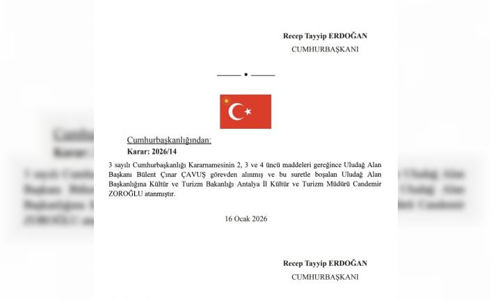 17 Ocak 2026 Cumartesi günü yayımlanan Resmi Gazete kararlarına göre, 3 sayılı Cumhurbaşkanlığı Kararnamesinin 2, 3 ve 4’üncü maddeleri gereğince Uludağ Alan Başkanı Bülent Çınar Çavuş görevden alındı. Çavuş’tan boşalan Uludağ Alan Başkanlığı görevine, Kültür ve Turizm Bakanlığı Antalya İl Kültür ve Turizm Müdürü Candemir Zoroğlu atandı.