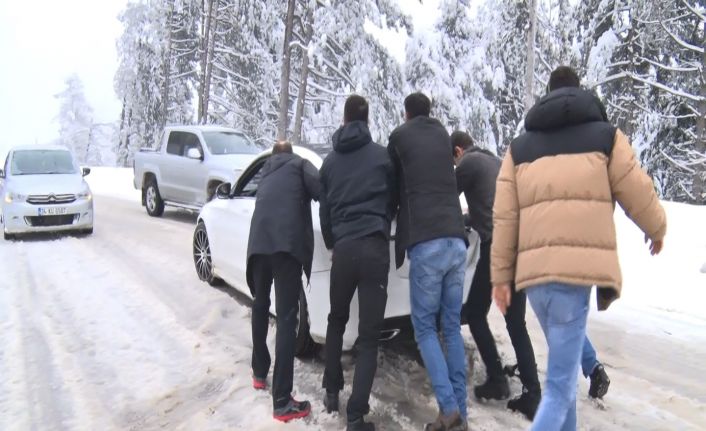 Uludağ’a çıkmak isteyen tatilciler aniden yağan kar sebebiyle yolda kaldı. Araçlarında kış lastiği ve zincir bulunmayan vatandaşlar yolda kaldı. Yolu açmak için büyük çaba gösteren vatandaşların imdadına ise görevden dönen jandarma ekipleri yetişti. Uzun araç kuyruklarının oluştuğu Uludağ yolunda jandarma ekipleri ve vatandaşlar yolda kalan araçları kenara çekerek yolu açtı. Kış lastiği ve zincir olmadan çıkışa izin verilmeyen Uludağ’da yolda kalan araçların hareket edebilmesi için zincir takmaları istendi. Araçlarına zincir takılmasını fırsat bilen bazı vatandaşlar ise yol kenarında kar topu oynayıp kızakla kayarak bu durumu fırsata çevirdi. Zincirlerini takan sürücüler yollarına kaldıkları yerden devam etti.