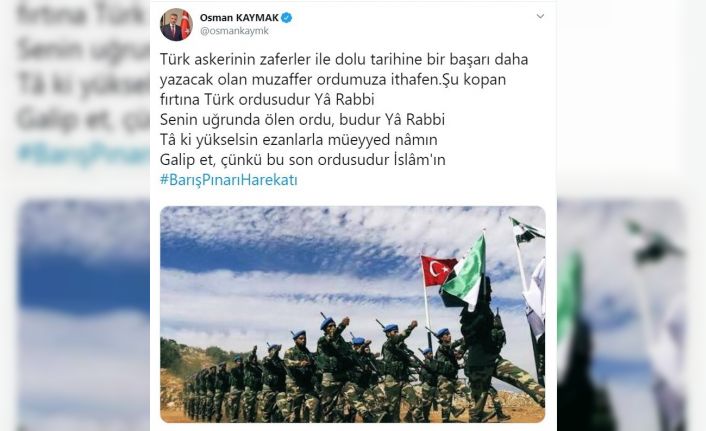 Vali Kaymak, mesajının devamında, "Suriye’nin kuzeyinde oluşturulmaya çalışılan terör koridorunu yok etmek, bölgeye barış ve huzuru getirmek amacıyla PKK/YPG ve DEAŞ terör örgütlerine karşı Barış Pınarı Harekatı’nı başlatan Türk Silahlı Kuvvetlerimize başarılar diliyoruz. Allah Mehmetçiğimizi korusun” ifadelerine yer verdi ve harekata katılan bütün askerlere muvaffakiyet diledi.