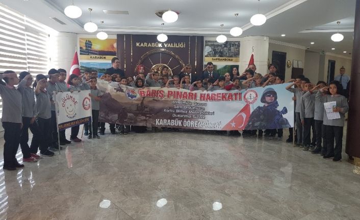 Karabük Valisi Fuat Gürel, proje kapsamında kendisini ziyaret eden Çelik İş Ortaokul öğrencileri ile birlikte asker selamı vererek, Barış Pınarı Harekatında bulunan askerlere destek verdi.