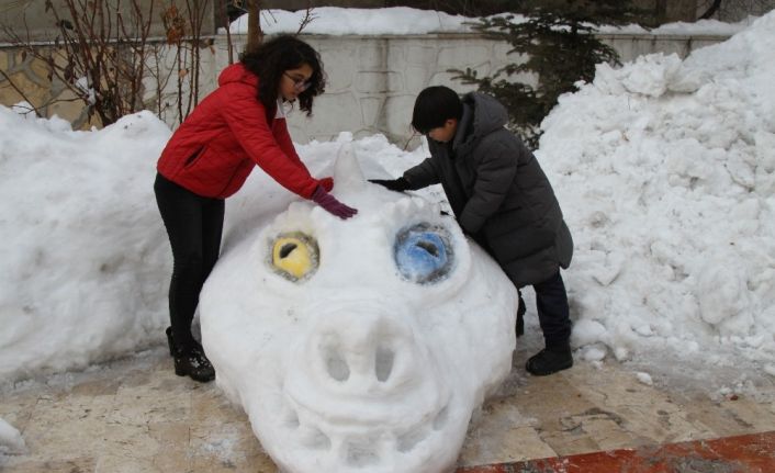 Vanlı öğrenciler derste öğrendikleri üç boyutlu heykel çalışmalarını dış mekana taşıyarak kardan Van Gölü canavarı yaptı.