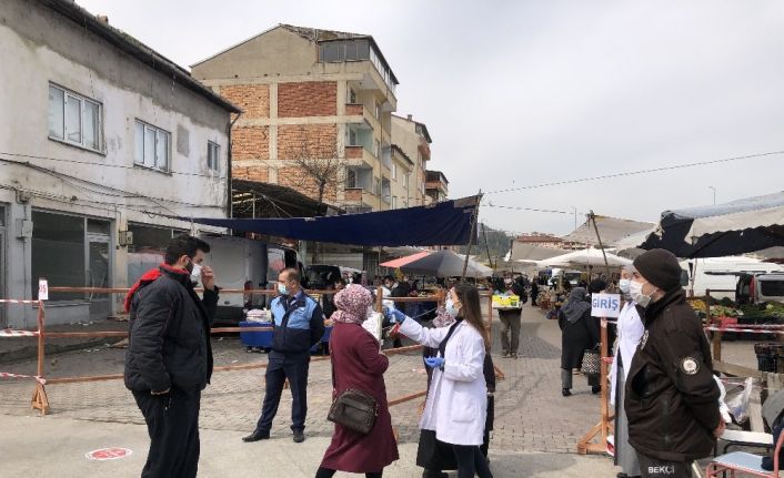 Karabük’ün Yenice ilçesinde vatandaşlar yeni tip Korona virüs (Covid-19) salgını nedeniyle pazar alanlarına ateşleri ölçüldükten sonra alınırken, maskesiz kimsenin girmesine izin verilmedi.