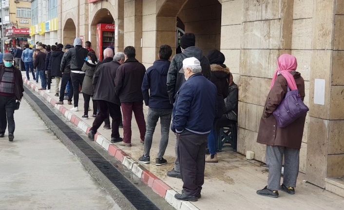 Karabük’te yeni tip korona virüsü (Covid-19) salgını nedeniyle, vatandaşlara sık sık ‘Evde kal’ çağrısı yapılmasına rağmen postane önünde uzun kuyruklar oluştu. Türkiye genelinde 2 milyon aileye verilecek olan bin TL sosyal yardım parası, işsizlik parası ve gişe işlemleri için postaneye gelerek yoğunluk oluşturan vatandaşlara bekçiler ‘sosyal mesafe’ konusunda uyarılarda bulundu. Ayrıca bekçiler, maskesiz sıraya girenlere de maske takmaları konusunda da uyarılarını ihmal etmedi.