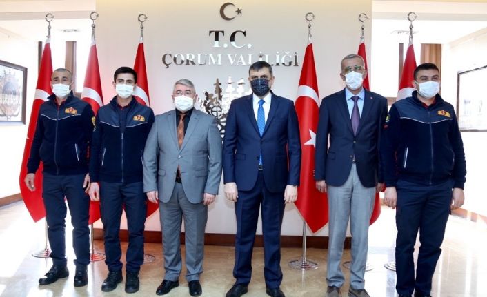 Çorum Valiliğinde düzenlenen törende Çorum Belediyesi İtfaiye Müdürlüğü ekip amiri Murat Tıraş ve itfaiye erleri Kamil Hombaç ile Ali Öremiş’e başarı belgeleri Vali Mustafa Çiftçi ve Belediye Başkanı Dr. Halil İbrahim Aşgın tarafından verildi.