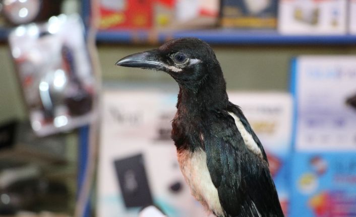 Kahramanmaraş’ta bir hayvansever esnafın, piknik için gittiği mesire alanında yaralı olarak bulup tedavi ettirdiği karga iş hanının maskotu haline geldi.