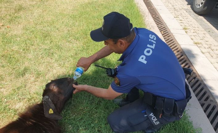 Kayseri’nin Melikgazi ilçesinde sahibinden kaçarken otomobil çarpması sonucu yaralanan kurbanlık keçiye, polis ekipleri elleriyle su içirdi.