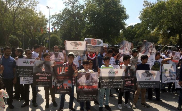 Türkiye’de yaşayan Yemenliler, Birleşik Arap Emirlikleri’nin (BAE) 4 yıldır ülkelerine düzenlediği saldırıları protesto etti. Fatih’te düzenlenen eylemde Yemenli yüzlerce kadın, çocuk, genç ve yaşlı, ellerindeki dövizlerle sloganlar atarak saldırılara tepki gösterdi. Eylemde, son zamanlarda gerçekleştirilen saldırılarda hayatlarını kaybedenler için de gıyabi cenaze namazı kılındı. Yemenliler, yasal kuruluşları, BM kurumlarını, insan hakları örgütlerini, İslam Yardımlaşma Teşkilatı’nı, Arap Birliği’ni, Körfez İşbirliği Konseyi’ni ve tüm uluslararası insani ve hukuki örgütleri Yemen’in ve Yemen halkının yanında durmaya çağırdıklarını ve Birleşik Arap Emirlikleri’nin yaptığı terör eylemlerine yardım ve yataklık edilmesinin durdurulmasını talep ettiklerini belirttiler.