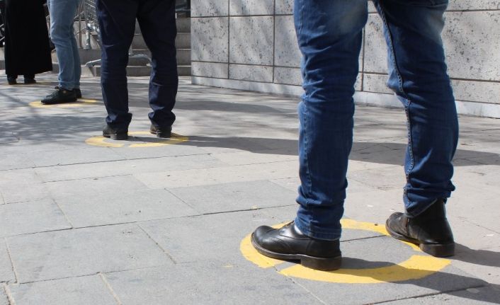 Korona virüs salgınına karşı Elazığ’da banka ve ATM önlerinde yaşanan yoğunluğun önüne geçilerek sosyal mesafenin korunması amacıyla vatandaşların duracakları noktalar daire şeklinde boyanarak düzenlendi.
