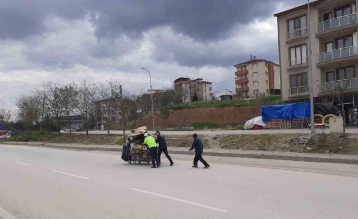 Bilecik’in Osmaneli ilçesinde bayramda asayiş ve trafik uygulaması yapan polis ekipleri, kağıt toplayan yaşlı adamın arabasını çekmekte zorlandığını görünce yardımına koştu.