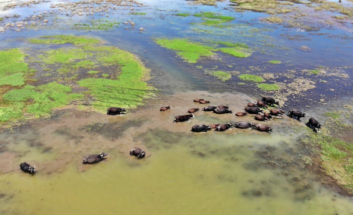 HAKKARİ (İHA) – Hakkari’nin Yüksekova ilçesindeki mandaların su içinde gezmesi Afrika’da çekilen belgeselleri aratmadı.