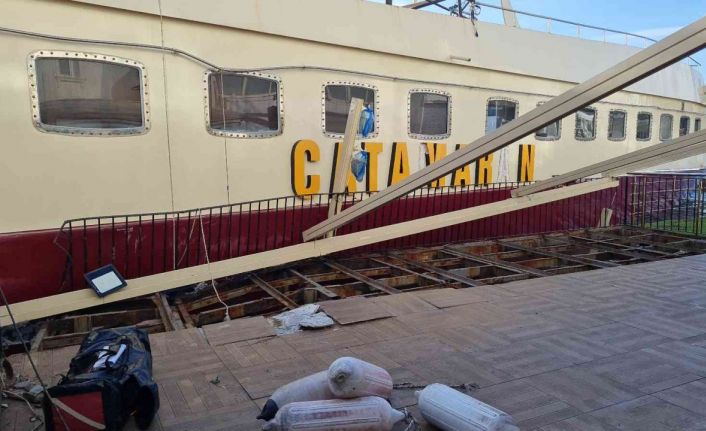 Muğla’nın Bodrum ilçesinde fırtına ile sürüklenerek işletmelere çarpan yüzer disko Catamaran’ı kurtarma çalışması başlatıldı.