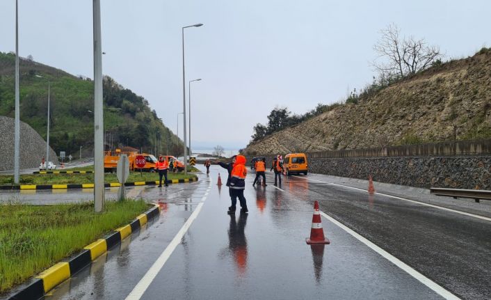 Zonguldak’ın Alaplı ilçesinde yağmurun ardından yumuşayan zeminden kopan kaya ve toprak parçaları karayolunu ulaşıma kapattı.