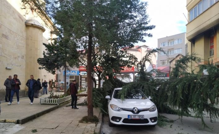 Üzerine ağaç devrilen araçta ağır hasar oluştuğu belirtildi.