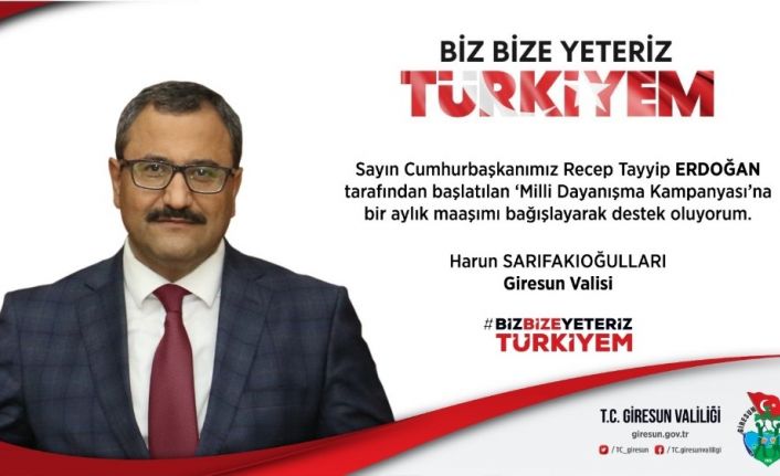 Bu kapsamda tamamen gönüllülük esasına dayalı bir kampanya olan Milli Dayanışma Kampanyası’na katılan Giresun Valisi Harun Sarıfakıoğulları “Cumhurbaşkanımız Recep Tayyip Erdoğan’ın önderliğinde gerçekleştirilen Milli Dayanışma Kampanyası’nı ilimizde görev yapan tüm kamu kurum ve kuruluş müdürlerimizle birlikte katılıyoruz. Ben de kampanyaya bir aylık maaşımı bağışlayarak destek veriyorum” dedi.