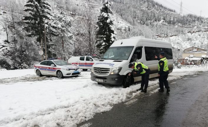 Giresun’un yüksek ilçe ve mevkilerinde etkisini gösteren kar yağışıyla birlikte Giresun İl Jandarma Komutanlığı trafik ekipleri de karın ulaşımı aksatmaması için kış lastiği denetimlerini sıklaştırdı.