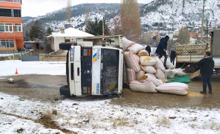 Giresun’un Alucra ilçesi şehir merkezi Yunus Emre Mahallesinde gizli buzlanma nedeniyle saman yüklü kamyon kontrolü kaybederek devrildi.