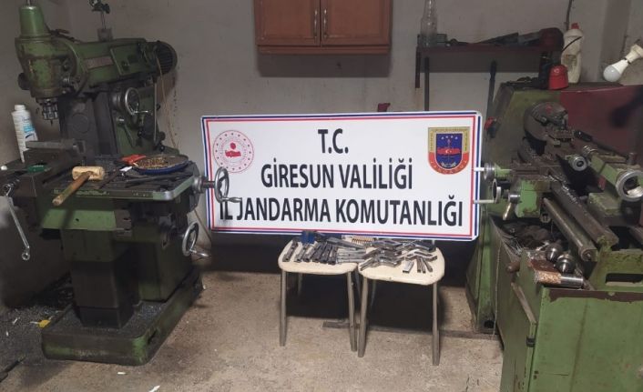 Espiye ilçesi Cibril mahallesinde İ.K. ve M.K.’ya ait ev ve eklentilerinde İl Jandarma Komutanlığı ekipleri tarafından yapılan aramalarda 1 adet silah imalathanesi bulundu. Aramaların devamında 3’ü el yapımı, 3’ü de kuru sıkıdan dönüştürme toplam 6 tabanca, 6 adet tabanca gövdesi, 5 adet üset kapak, 12 adet tabanca namlusu, 10 adet şarjör, 190 adet 9 mm fişek, 12 adet 7,65 mm fişek, 8 adet 6,35 mm fişek, 1 adet torna makinesi, 1 adet freze makinesi, 1 adet dikey matkap, 1 adet el spirali, ele geçirildi.