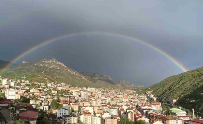 Gümüşhane kent merkezinde etkili olan yağışların ardından güneşin yüzünü gösterdiği anda çıkan gökkuşağı oluşturduğu güzel görüntüyle vatandaşların cep telefonuna sarılmasına neden oldu.